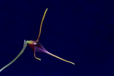 Masdevallia herradurae or Acinopetala herradurae is a small, floriferous species from Colombia and Ecuador. The plant is under 10 cm and the flowers are 2-3 cm. When the plant is in bloom the flowers look like a clouds of dark insects hovering around the plant. My plant is grown in a plastic net pot in live sphagnum.