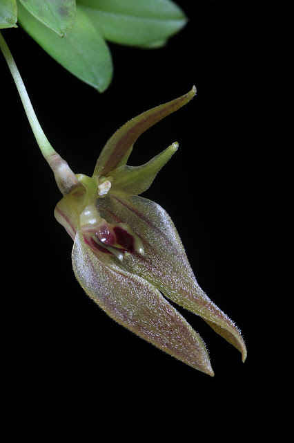 This unusual species is from New Guinea. I've just bloomed it for the first time and only one flower, so the photos are limited. The plant is a mass of thin growths with short fat leaves that remind me of some conifers. The flowers are less than 1 cm and are held "upside down" in comparison to most orchids, i.e., the lip is uppermost. Flowers like this that do not twist around before they open and that hold their lip uppermost are called non-resupinate. The species name, hippocrepiferum, means "horse-shoe carrying" and refers to the horseshoe-shaped and joined sepals (not really visible in these photos).