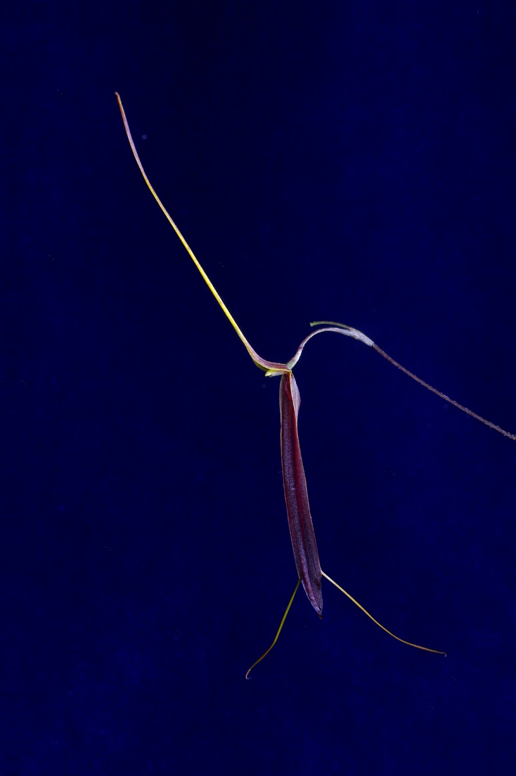 Masdevallia angulifera is from Colombia and belongs to the Saltarices group of Masdevallias. It has all the features of that group, colorful, tubular flowers lined with glandular hairs and a bulge at the base of the tube. Like the other plants in the group it is small, 12 cm, with 2.5 cm flowers. This clone is particularly dark and has been awarded by the American Orchid Society.